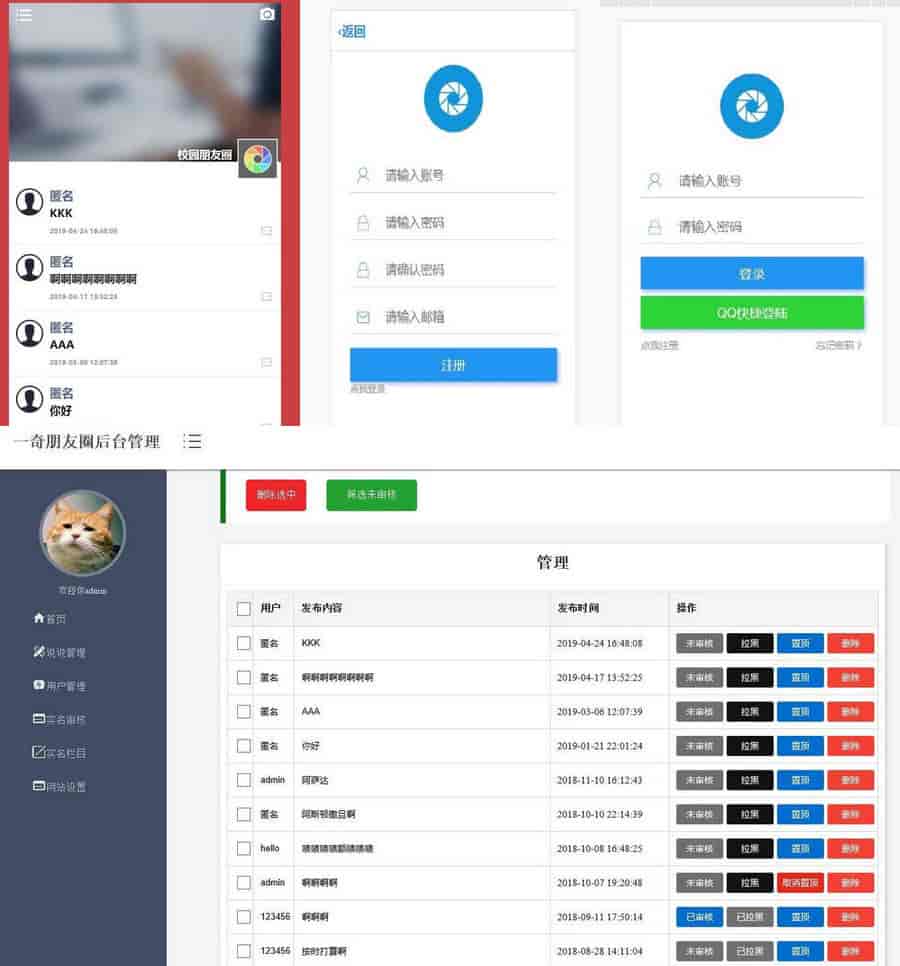 后台管理系统具备说说管理功能,包括审核、拉黑用户、置顶、删除等功能。