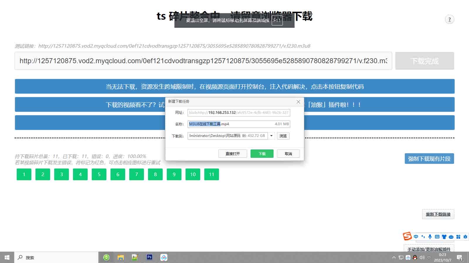 3,等待碎片总量以及进度为100%全部完成后将自动合并弹出下载