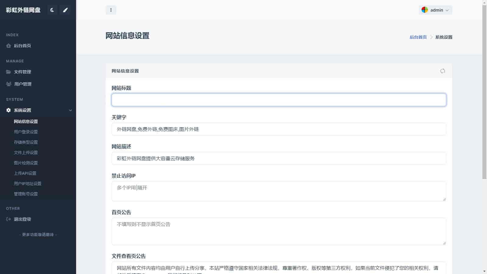 全新UI彩虹外链网盘系统源码前后端美化模板,支持所有格式文件的上传、生成文件外链、图片外链、音乐视频外链等功能,同时还可以自动生成相应的 UBB 代码和 HTML 代码,支持文本、图片、音乐、视频在线预览。这不仅仅是一个网盘,更是一个图床亦或是音乐在线试听网站。