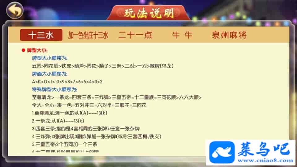 免摆13张规则:与上类似,最大的是有同花顺或者炸弹的,不用摆牌。都有同花顺或炸弹的,就都不用摆牌,直接比大小