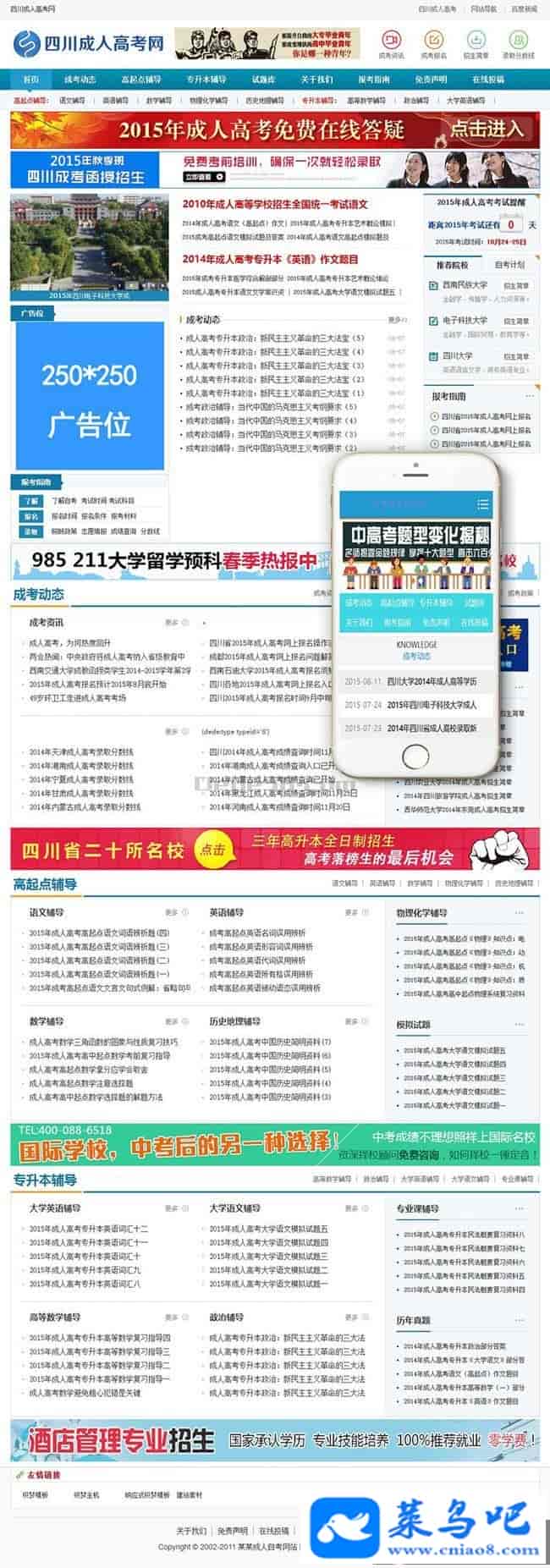 织梦DEDECMS招生资源成人高考报名自考资讯网站源码(带手机端)+PC+移动端+利于SEO优化依据织梦最新内核开发的模板,该模板属于成人高考、成人自考、考试资讯类企业都可使用,这款模板使用范围极广,不仅仅局限于一类型的企业,你只需要把图片和产品内容,换成你的,颜色都可以修改,改完让你耳目一新的感觉!自带最新的手机移动端,同一个后台,数据即时同步,简单适用!原创设计、手工书写DIV+CSS,完美兼容IE7+、Firefox、Chrome、360浏览器等;主流浏览器;页面简洁简单,容易管理,DEDE内核都可以使用;附带测试数据!