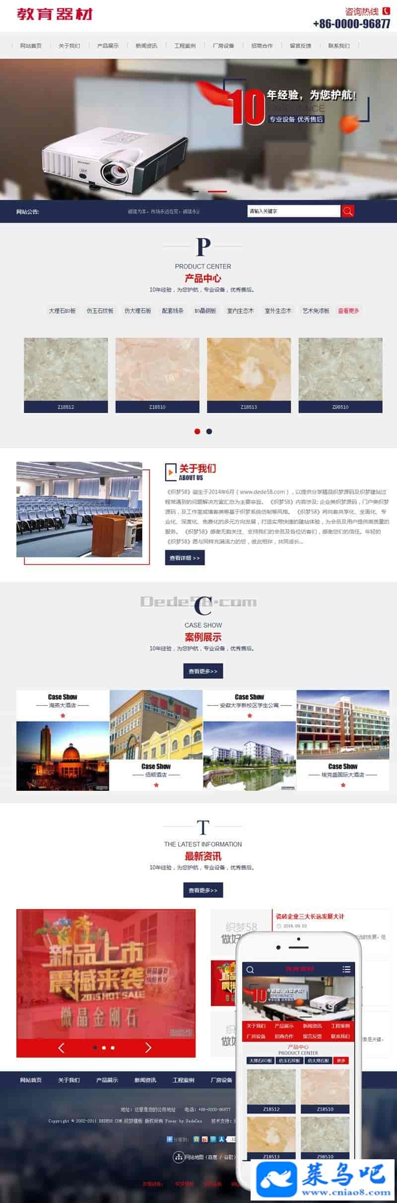 模板介绍:织梦最新内核开发的模板,该模板属于企业通用类、办公文教、教育器材类企业都可使用,这款模板使用范围极广,不仅仅局限于一类型的企业,你只需要把图片和产品内容换成你的,颜色都可以修改,改完让你耳目一新的感觉!自带最新的手机移动端,同一个后台,数据即时同步,简单适用!原创设计、手工书写DIV+CSS,完美兼容IE7+、Firefox、Chrome、360浏览器等;主流浏览器;页面简洁简单,容易管理,DEDE内核都可以使用;附带测试数据!