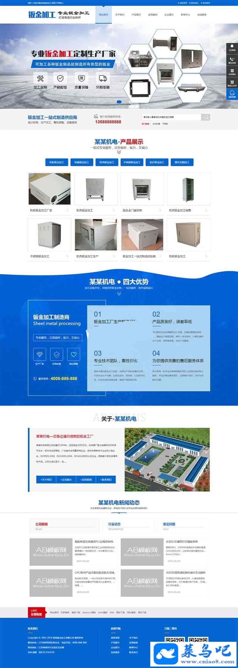 织梦dedecms蓝色钣金加工五金机电设备公司网站模板(带手机移动端)本套织梦模板采用织梦最新内核开发的模板,这款模板使用范围极广,不仅仅局限于一类型的企业,钣金加工、五金机电类的网站都可以用该模板。你只需要把图片和产品内容换成你的即可,颜色都可以修改,改完让你耳目一新的感觉!布局规整,利于用户体验,手工书写DIV+CSS,代码精简。
