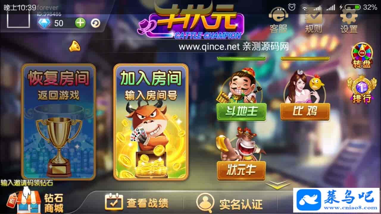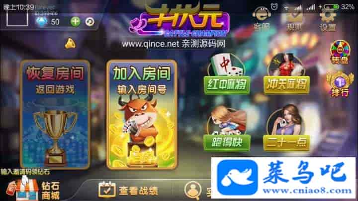 8人十三水、五十K、牛牛、干瞪眼、斗地主、比鸡、跑得快、红中麻将、二十一点、冲天麻将、状元牛