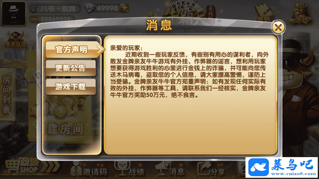 其实这款就是在原来的老铁牛牛上换了个手端,与98K为同一公司所出,本程序带2端、WEB、DB、服务端,听说这个蛮多BUG的,本站已经修复了点,没有原来的老铁牛牛好,但是相对增加了点玩法,俱乐部中带抽水功能及上下分功能,但人数仍为8人,这就很尴尬了。增加普通场与比赛场!