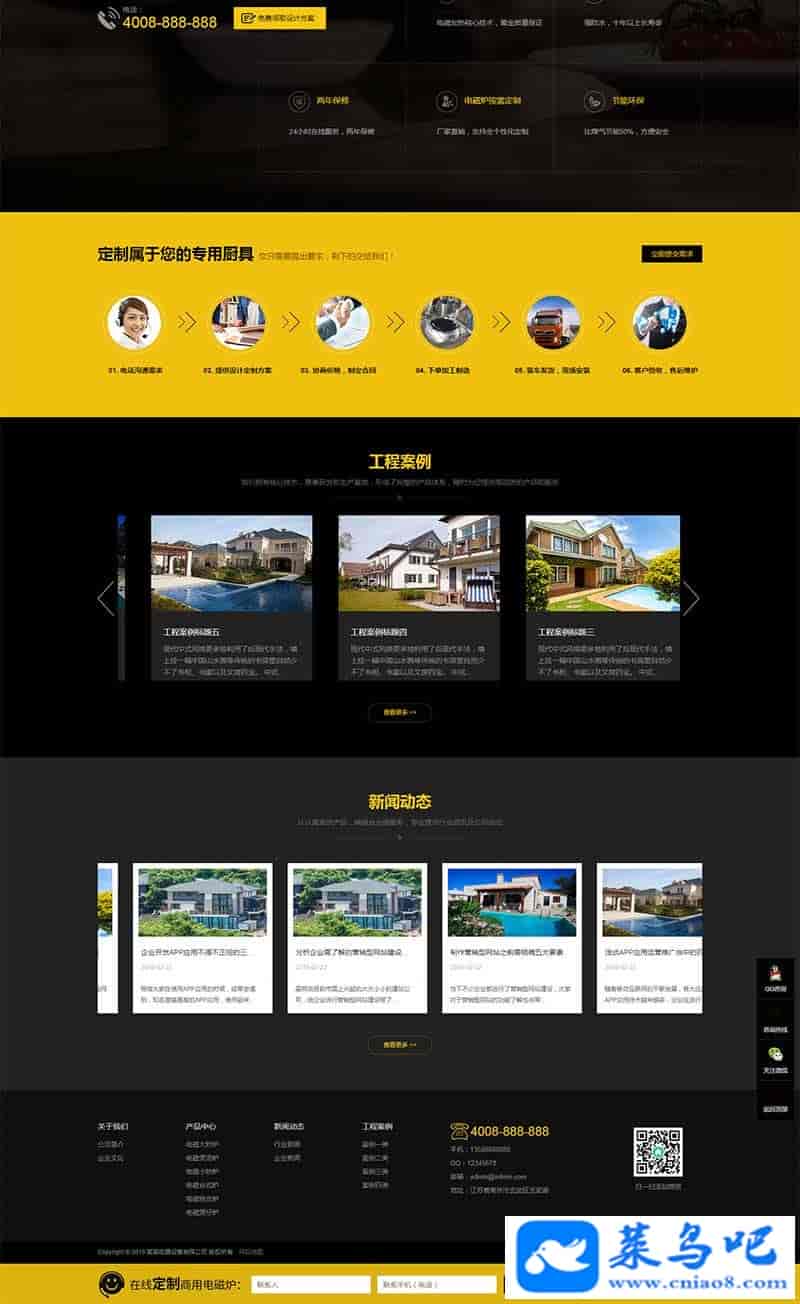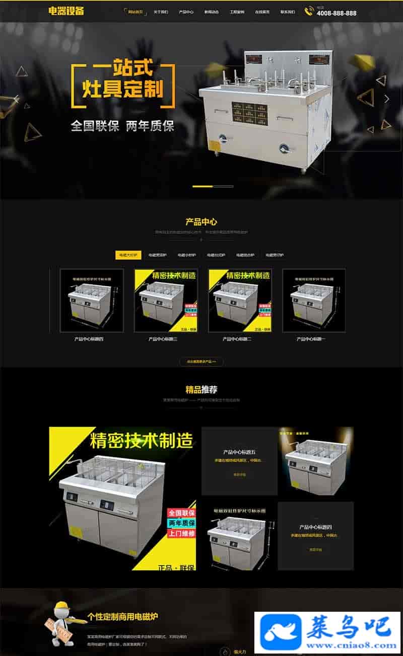 织梦dedecms黄黑色厨房用品电器设备企业网站模板(带手机移动端)本套织梦模板采用织梦最新内核开发的模板,这款模板使用范围极广,不仅仅局限于一类型的企业,厨房设备、电器设备类的都可以用该模板。你只需要把图片和产品内容换成你的即可,颜色都可以修改,改完让你耳目一新的感觉!布局规整,利于用户体验,手工书写DIV+CSS,代码精简。