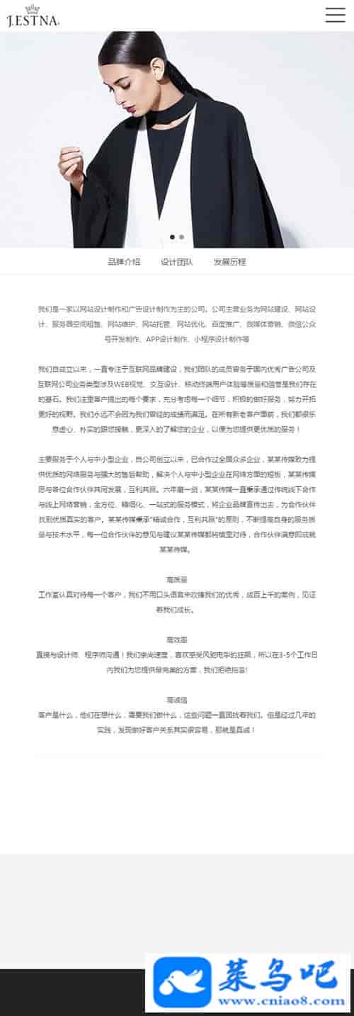 织梦dedecms响应式品牌服装时装设计企业网站模板(自适应手机移动端)该模板是非常容易存活的,这样的网站很容易吸引访客点击,提升ip流量和pv是非常有利的,随便挂点联盟广告都能养活网站。