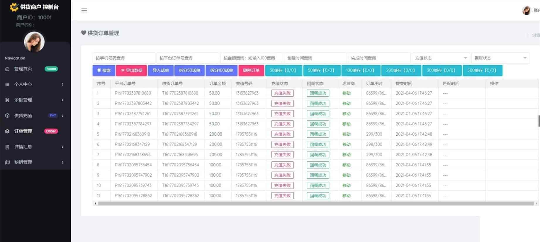 ④、自动检测号码是否已经完成充值返回官方订单号凭证给供应商反馈充值状态