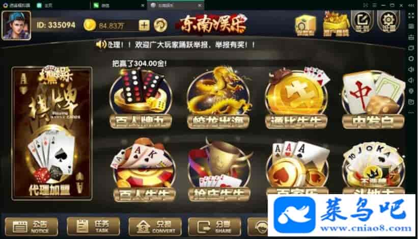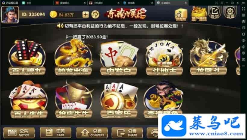 包含游戏:百人牌九、通比牛牛、抢庄牛牛、二八杠、蛟龙出海、李逵捕鱼、百人牛牛、斗地主、龙凤斗、百家乐、炸金花、红黑大战、水果拉霸等