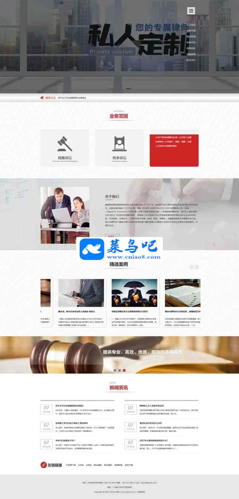 织梦dedecms大气宽屏律师事务所法律咨询服务公司网站模板主要有:关于我们、业务范围、精选案例、新闻资讯、律师团队、销售网络、联系我们等模块页面。