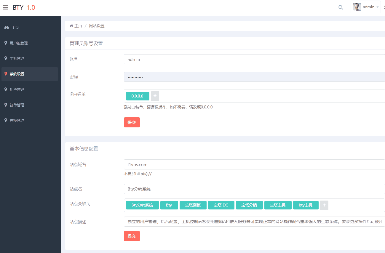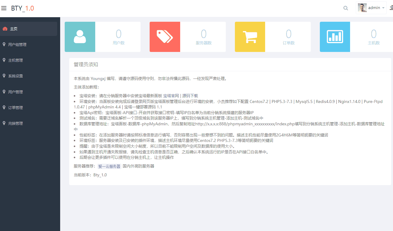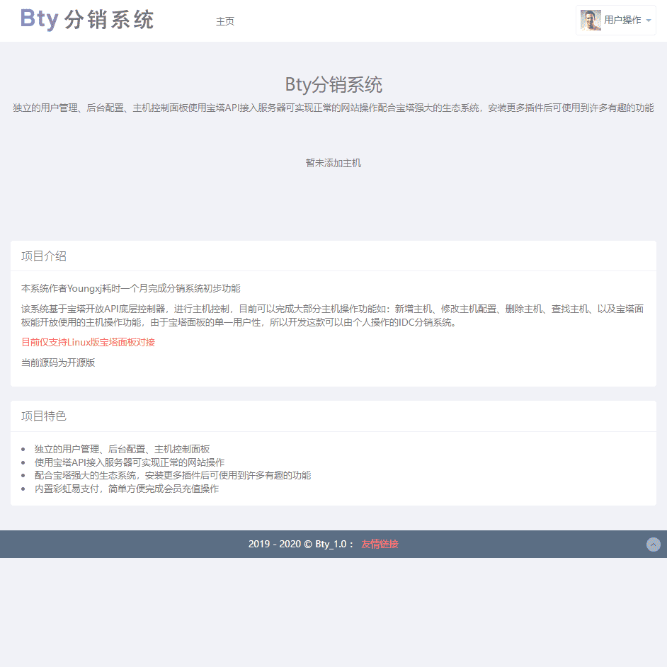 该系统基于宝塔开放API底层控制器,进行主机控制,目前可以完成大部分主机操作功能如:新增主机、修改主机配置、删除主机、查找主机、以及宝塔面板能开放使用的主机操作功能,由于宝塔面板的单一用户性,所以开发这款可以由个人操作的IDC分销系统。