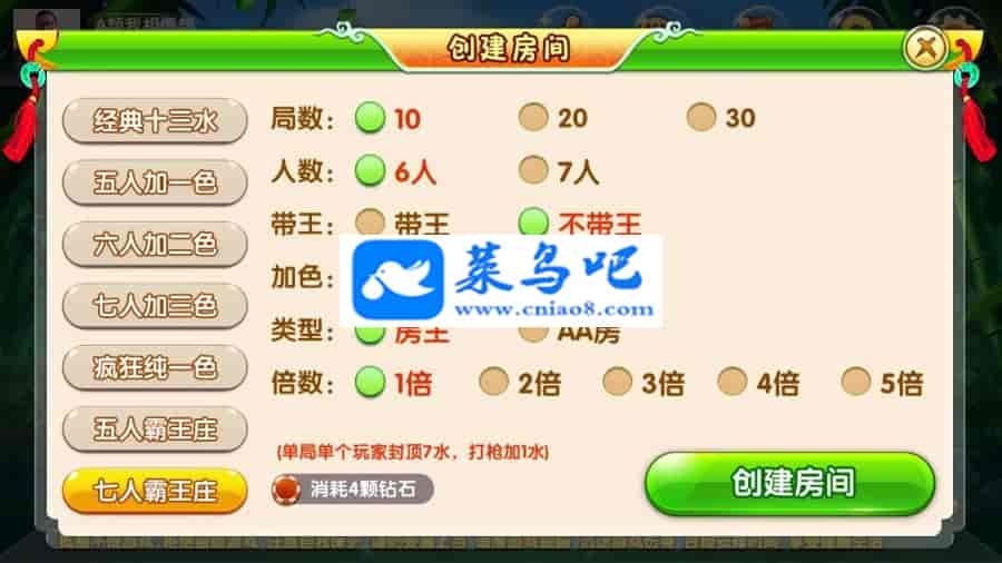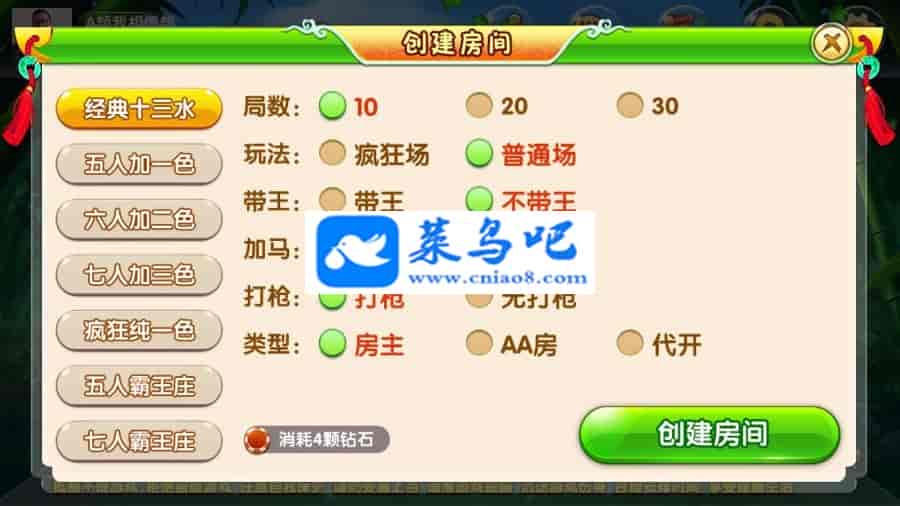 已有游戏玩法: 经典十三水 五人加一色 六人加二色 七人加三色 疯狂纯一色 五人霸王庄 七人霸王庄