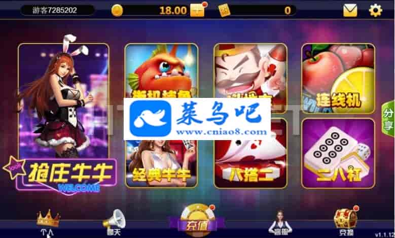 已有游戏玩法: 牛牛抢庄 经典牛牛 二八塔 二八杠 捕鱼 斗地主 连线777水果机