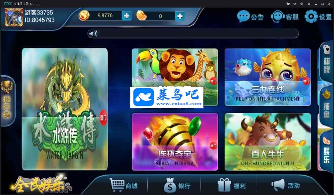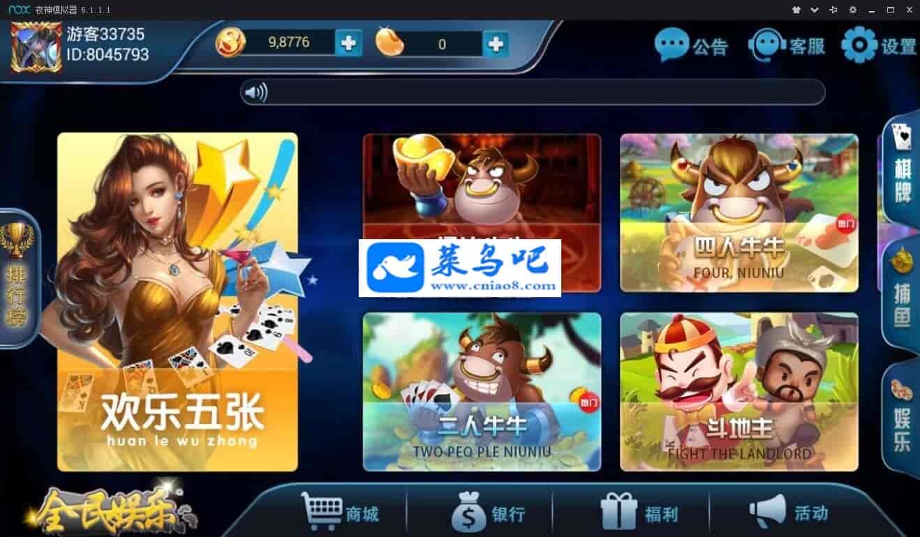 已有游戏玩法:欢乐五张:通比牛牛,二人牛牛,四人牛牛,斗地主,扎金花,李逵劈鱼,人鱼奇缘,摇钱树水浒传,飞禽走兽,连环夺宝,三九连线,百人牛牛,百人s宝,豪车俱乐部,欢乐三十秒