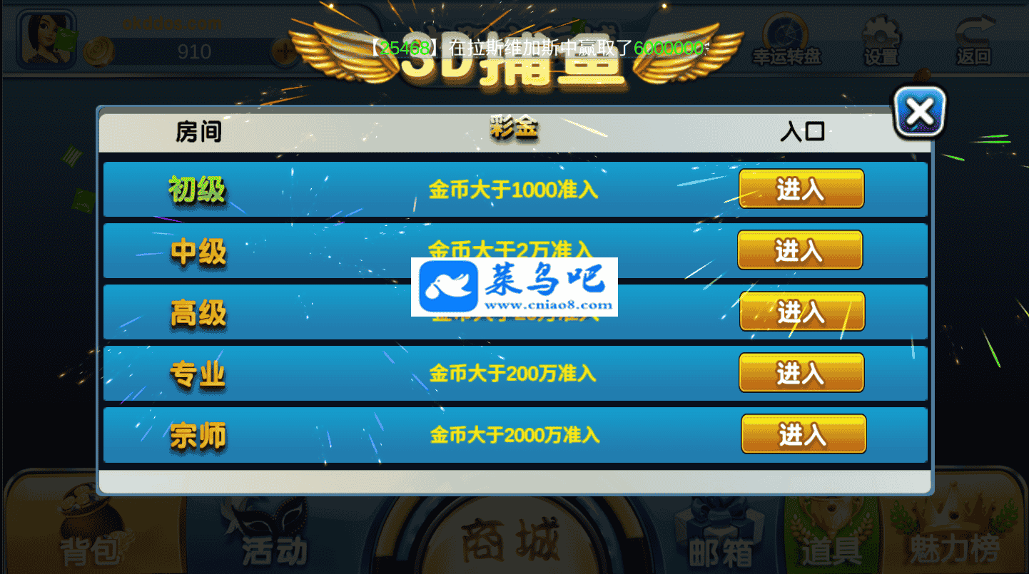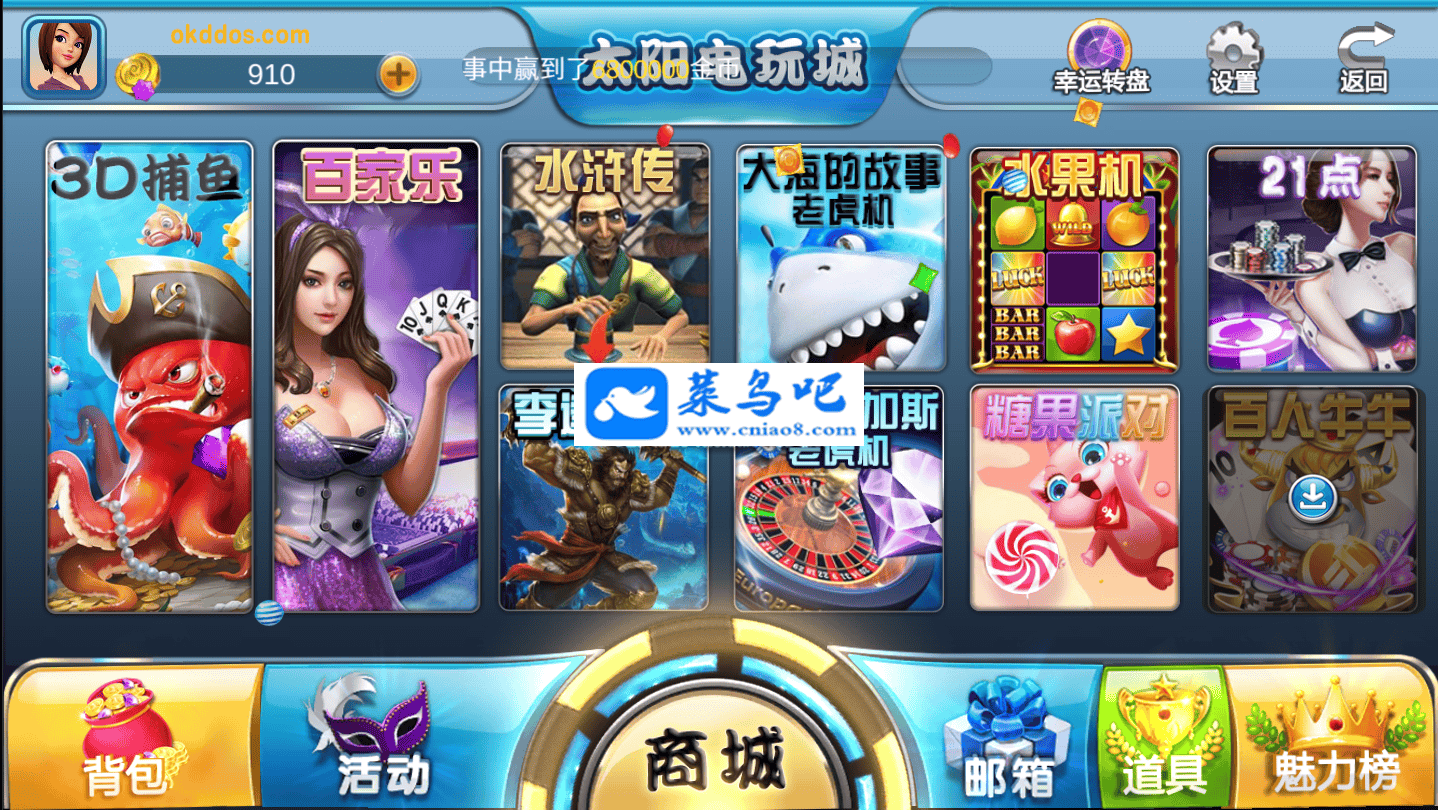 太阳电玩城组件,前端为U3D的,后台WEB进行控制,画面精美,游戏流畅,有1:1的感觉,带有滚动彩金。内带子游戏:3D捕鱼、***、水浒传、李逵X捕鱼、老X机、水果机、21点、牛牛。本套组件已含:WEB、服务端、数据库、手端。已测手端及IOS正常使用。