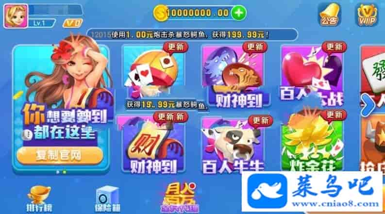 内含游戏: 斗地主、龙虎斗、红黑大战、二人麻将、捕鱼、跑得快、财神到、百人牛牛、炸金花、抢庄牛牛、德州扑克、***