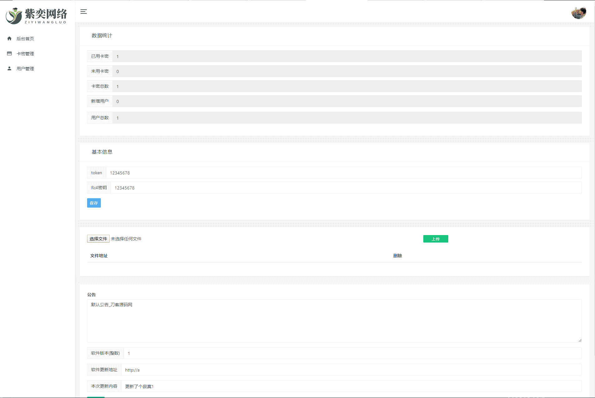 功能有 卡密系统 远程公告 远程更新 文件系统
