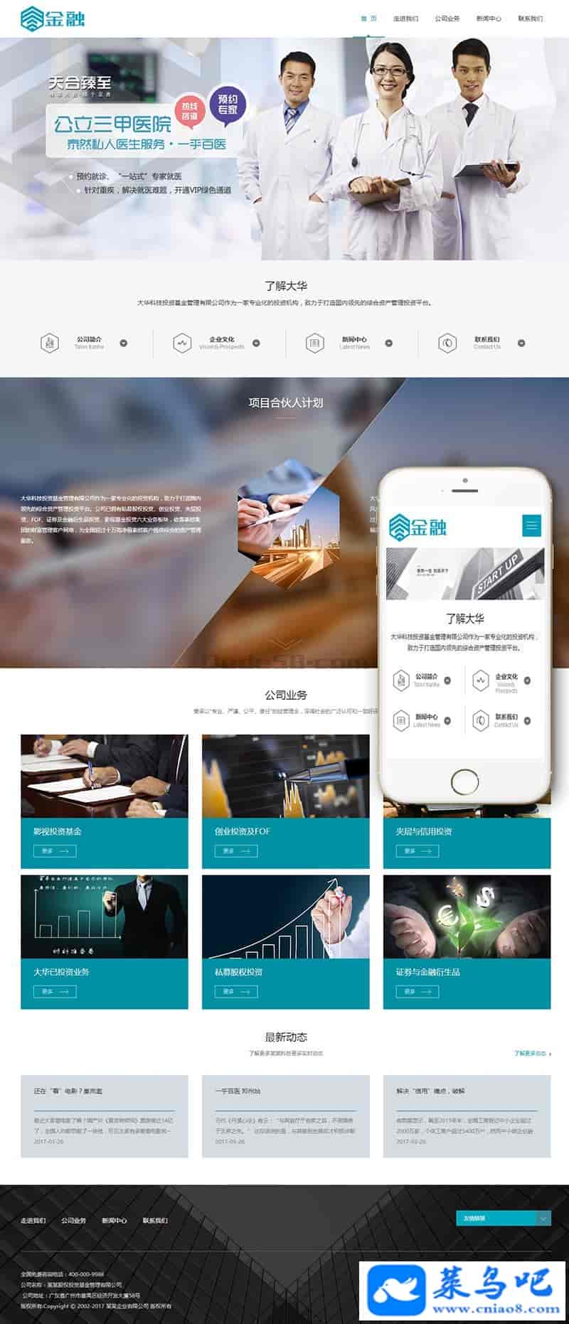 响应式金融股权投资管理企业织梦网站模板是一套简约大气时尚的公司企业类网站模板。模板页面设计的很大气很时尚,这也是国人最喜欢提到的两个关键点:大气,时尚。而这套模板可以说达到了这两个要求。首页设计的不仅大气时尚还很有特色,比如项目合伙人计划那一块就很有设计感,提升了网站的设计层次。当然,除了首页的设计外,其它页面的设计也是很出彩的,可惜的是差一个图片栏目展示页。不过新闻列表页也可用作图片栏目页。最最重要的是这是一套响应式的设计,让这套模板完美了许多。