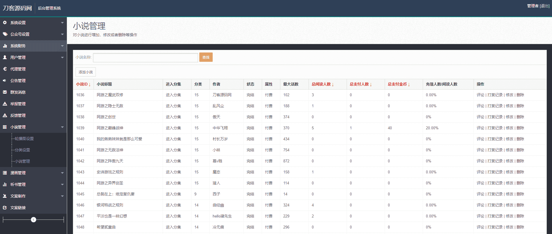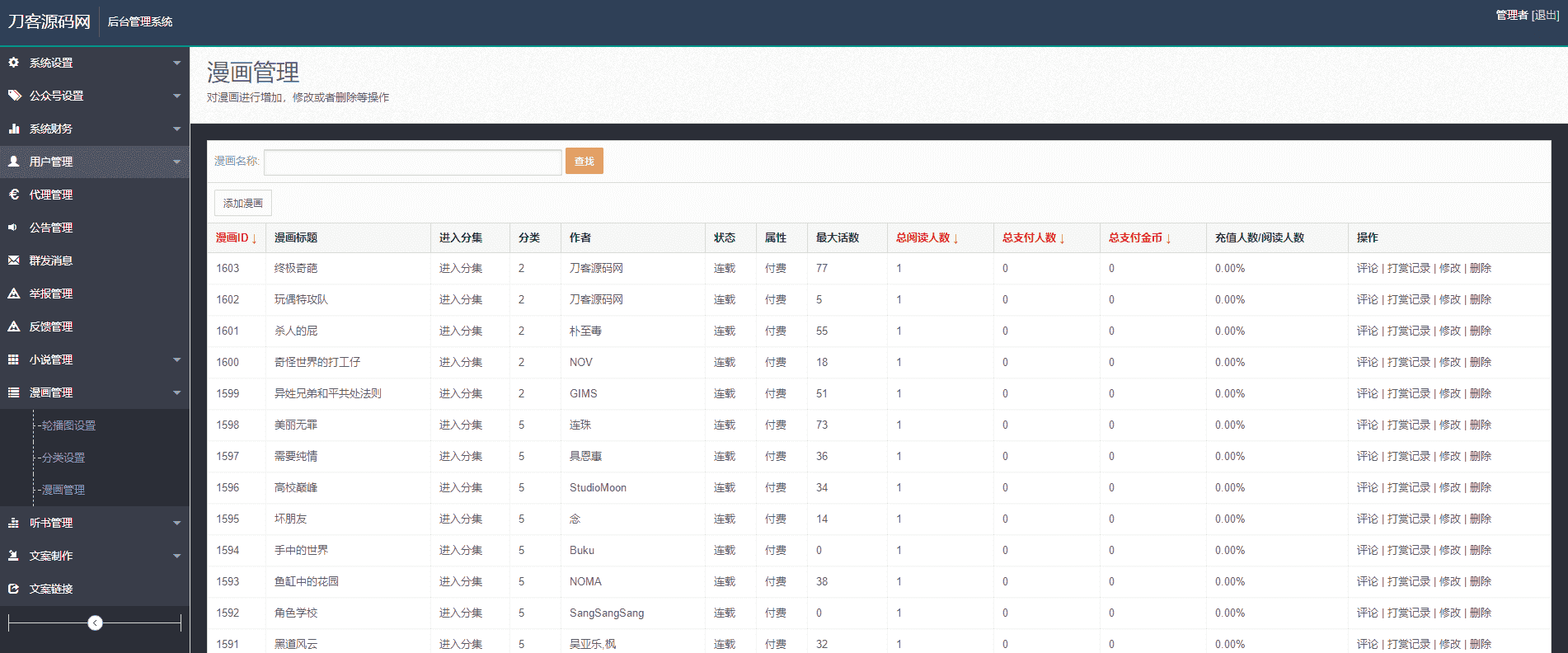 很多的站长都在找的源码,外面无错的也都卖到几K的,这里分享出来,并且修正了一些BUG,可以链接一个第三方的影视站点(电影类的论坛发布了不少自己再搭建一个就可以),并且该小说、漫画、听书聚合手机网站还带有打赏功能,试看功能,接入第三方的支付。