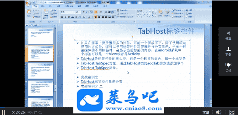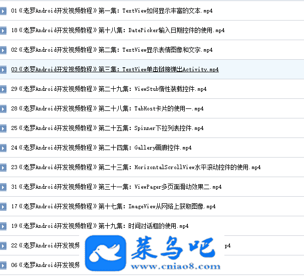 《Android视频教程(第一季)》的视频一共分为15个章节,涵盖了Android入门、常用UI布局介绍、HTTP编程、XML与Json数据解析、JDBC与Web编程、常用UI控件、数据储存与文件操作、对话框、通知、菜单、LoaderManager异步加载、多线程(AsyncTask与Handler)、百度地图等十五个模块,一共102集。