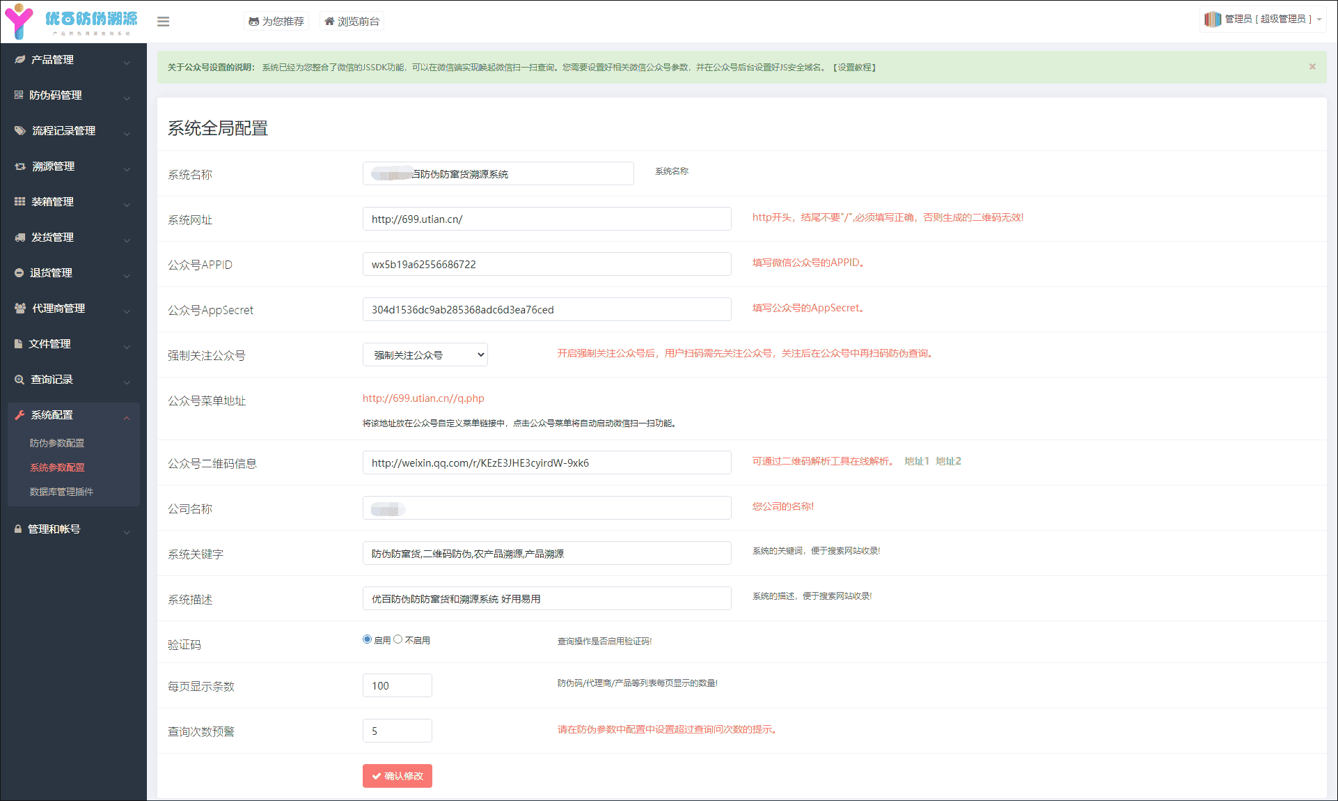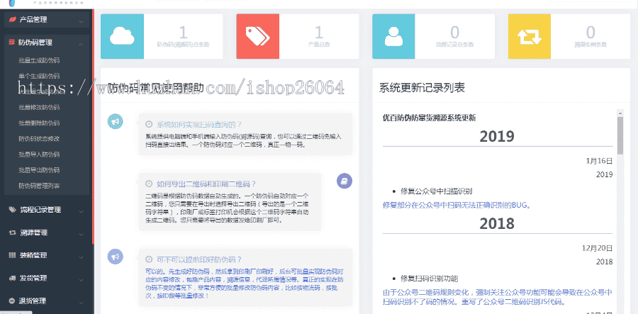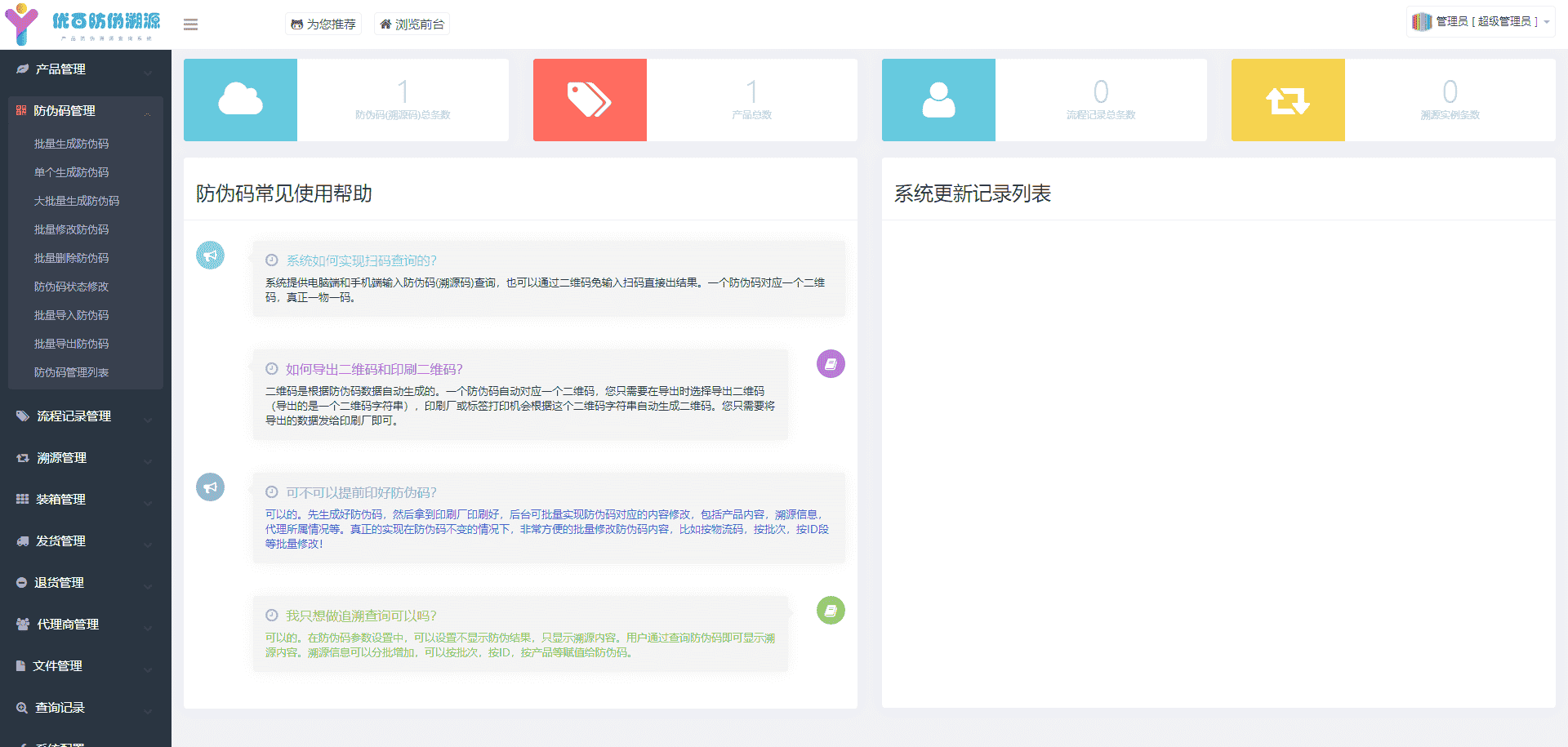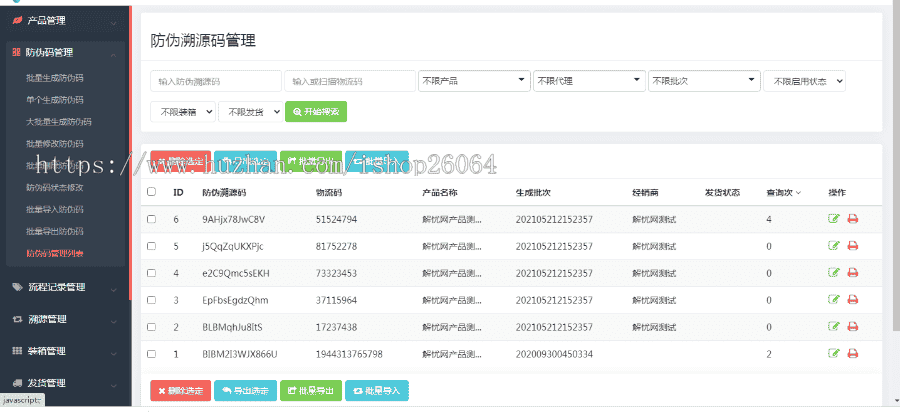 一物一码,活码管理。全平台防伪防窜货和溯源查询,装箱,发货,退货,流程记录以及经销商管理平台,广泛应用于农产品,食品,化妆品,药品,数码产品,电子电器,五金机械,烟酒,茶叶,服装鞋帽等防伪防窜货和产品追溯源查询。