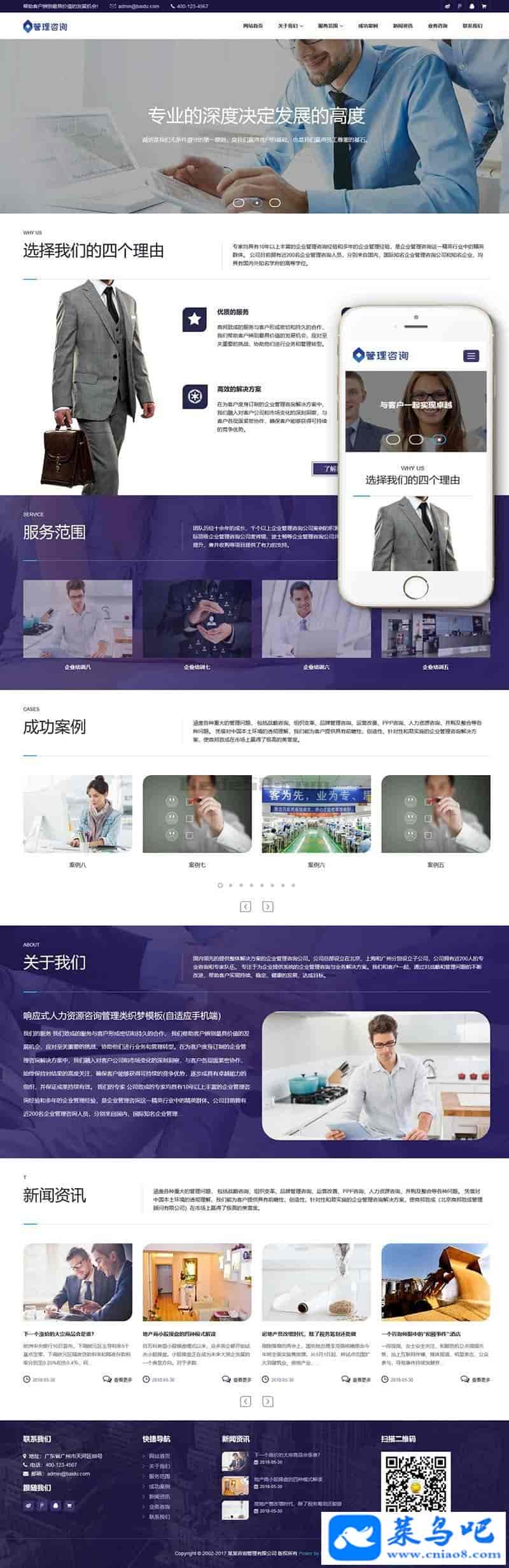 模板介绍:织梦最新内核开发的模板,该模板属于企业通用类、人力资源咨询管理、战略咨询、组织变革、品牌管理咨询、运营改善、PPP管理咨询类企业都可使用,