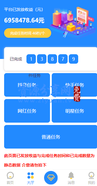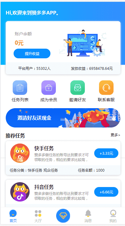 首页任务接单,主要分为抖音和快手任务关注点赞,用户可以领取符合要求的任务,复制任务打开 app 关注和点赞,截图提交,后台审核通过后即可领取佣金,根据不同的等级每天领取的任务个数和单价都不一样,后台设置,还可以通过海报推广好友,获取推广的返佣,同时还可以领取推广下线的任务返利。