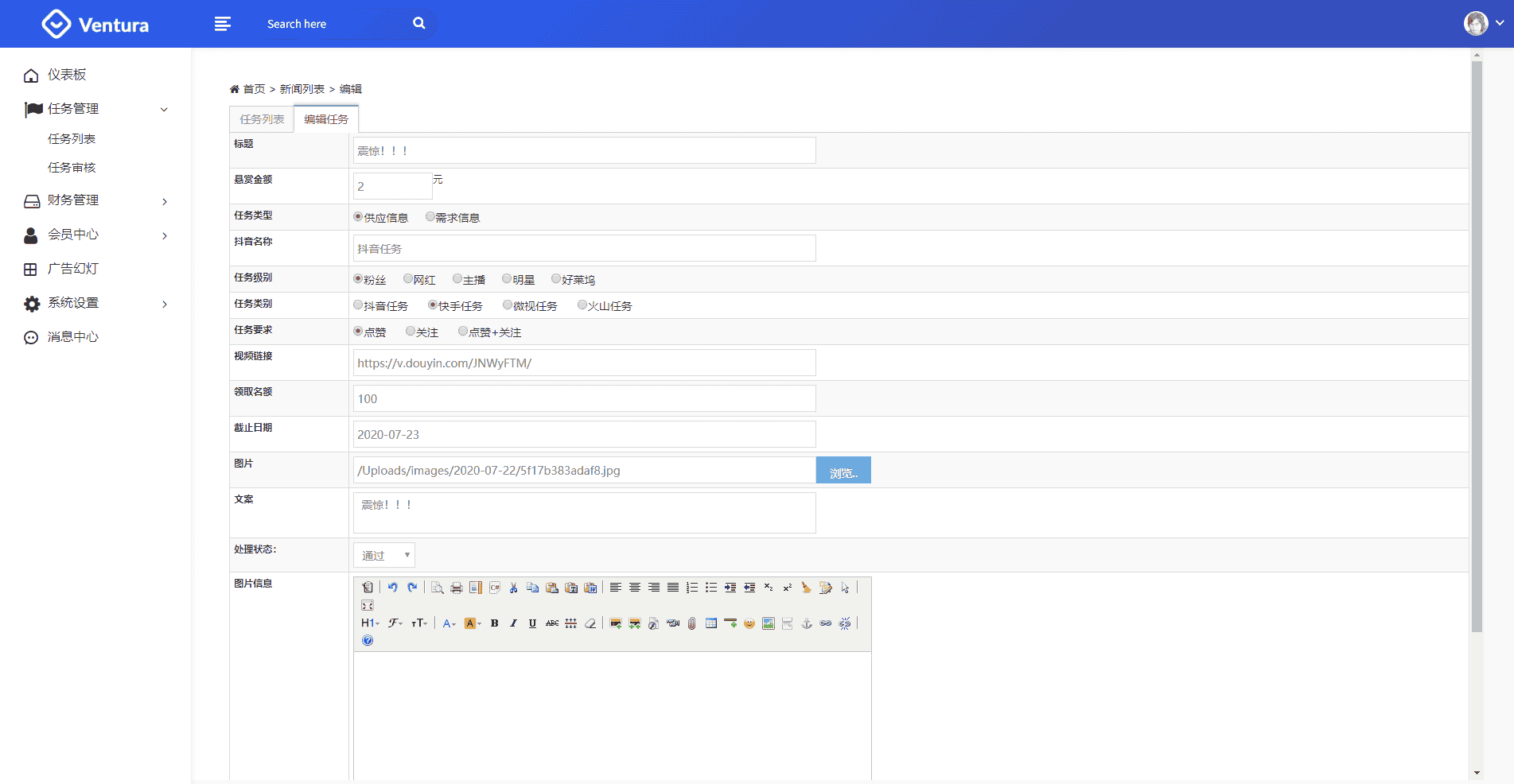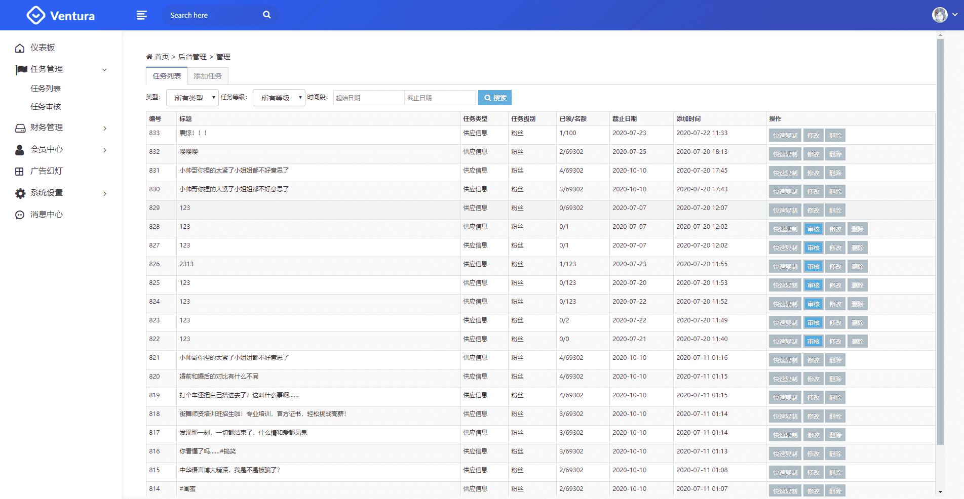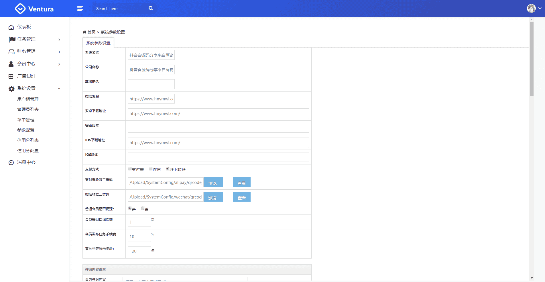 接口申请地址:www.smsbao.com短信接口配置文件:/Application/Home/Controller/PublicController.class.php (54~55行)后台地址:/index.php/Taskadmin前台账户:18888888888前台密码:18888888888