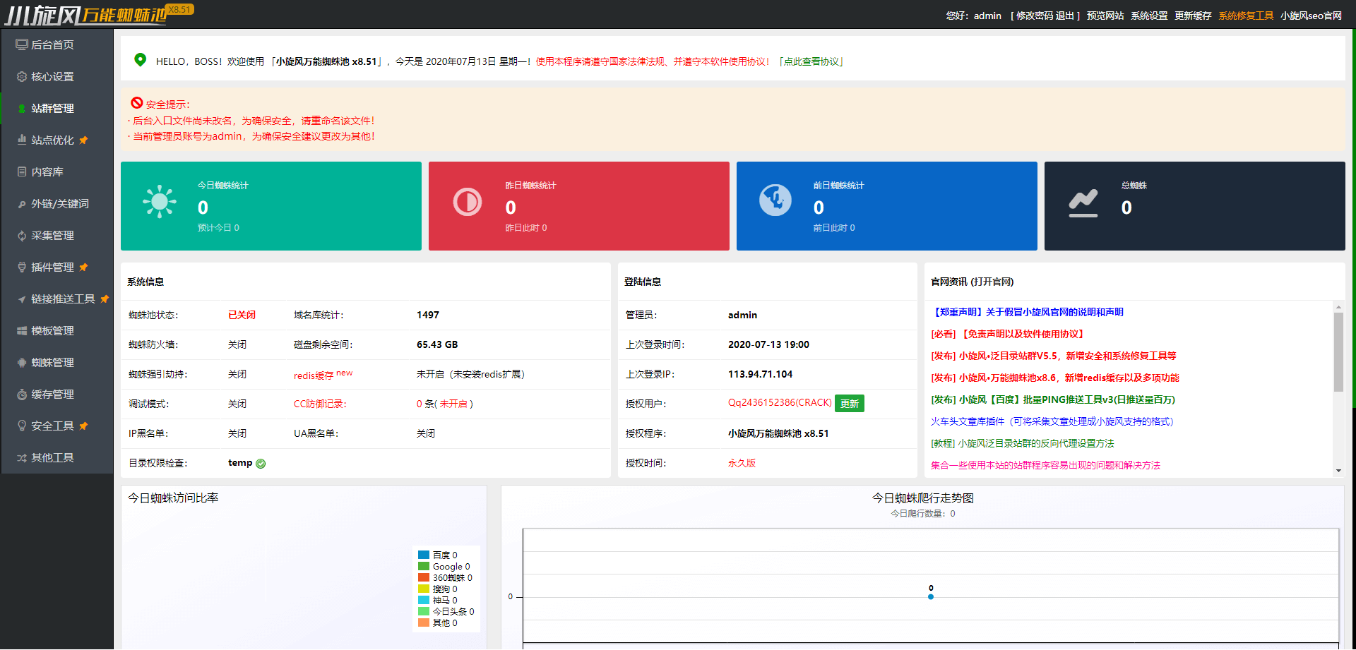 【修复版】八月最新亲测源码小旋风蜘蛛池站群X8.51无限制开心无域名授权破解版+自带30套模板