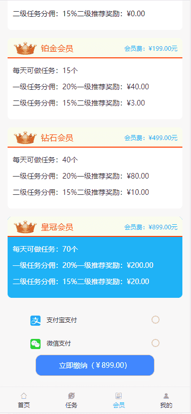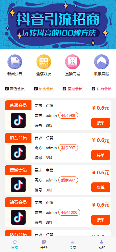 抖音网红爆款打造,点赞任务接单平台,这款的页面和UI还有机制都非常漂亮,邀请好友分佣奖励、任务接单提交、会员等级设定、任务分级、接单后点击任务链接自动跳转抖音视频。所有功能已经全部修复完美,搭建即用,微信支付宝双支付通道,派特个人免签,www.pet0.cn。预设直播商城接口,有需要可自行对接。