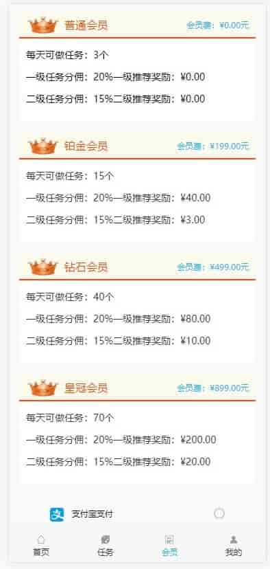 3、完整的会员制度。(璀璨钻石、钻石、黄金、白银、青铜、)以此类推(后台都可设置任务数量,会员费)