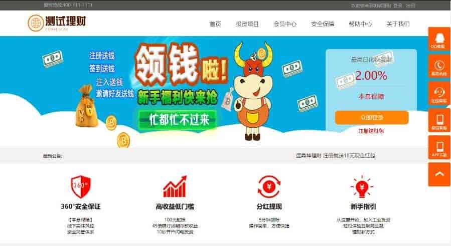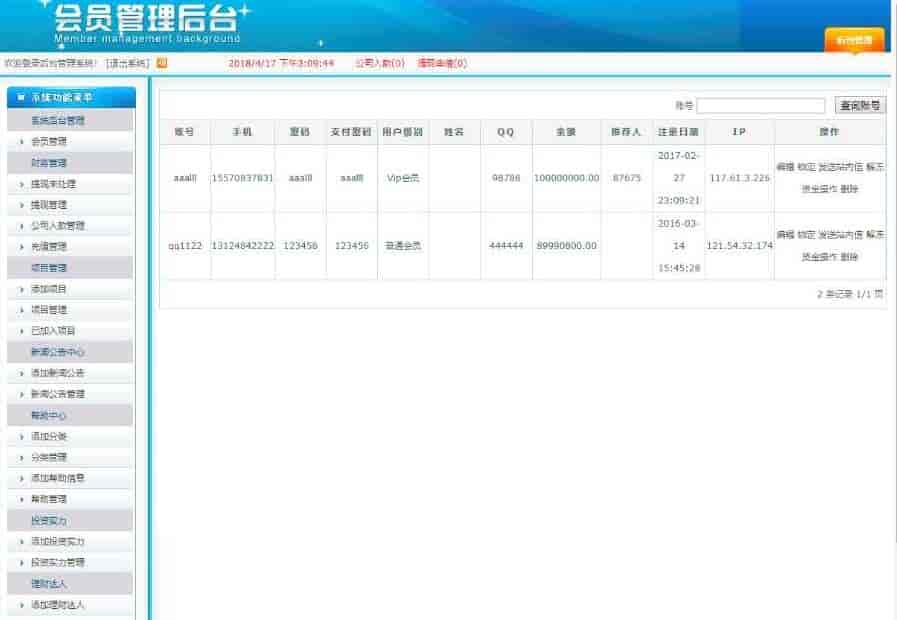 会员资金记录(可以查看到会员所有的交易操作资金记录),会员投资项目(查看会员所有投资项目),会员系统增加站内短信,短信内容在后台网站设置修改,同时会员区会语音提示有新短信!