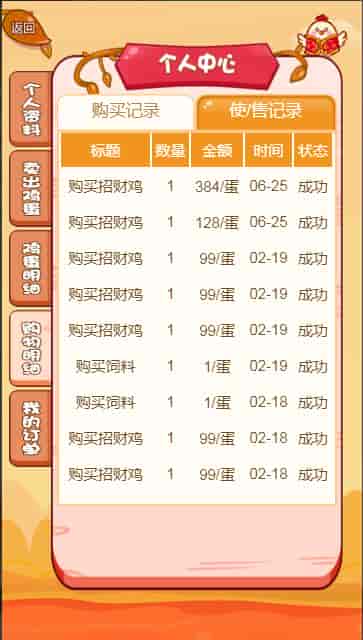 1.会员加入后先购买发财蛋,99个发财蛋可以购买一只发财鸡,然后购买点击购买饲料(1个发财蛋),然后喂食发财鸡,发财鸡喂食24小时后产蛋。