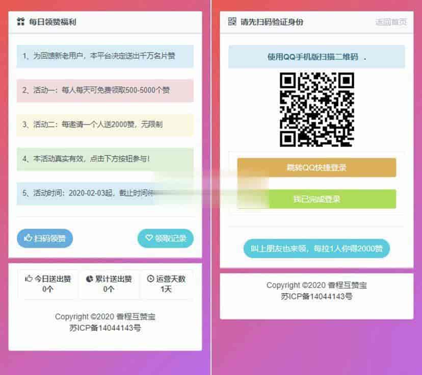 PHP互赞系统源码 香程互赞宝程序免授权用户扫码后每天可以免费领取 500-5000 个赞,非常适合无成本回馈客户,还具备无成本引流性质