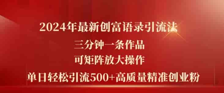 2024年最新创富语录引流法,三分钟一条作品,可矩阵放大操作,单日轻松引流500+高质量创业粉
