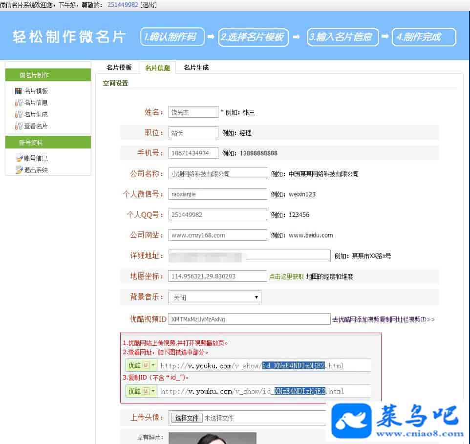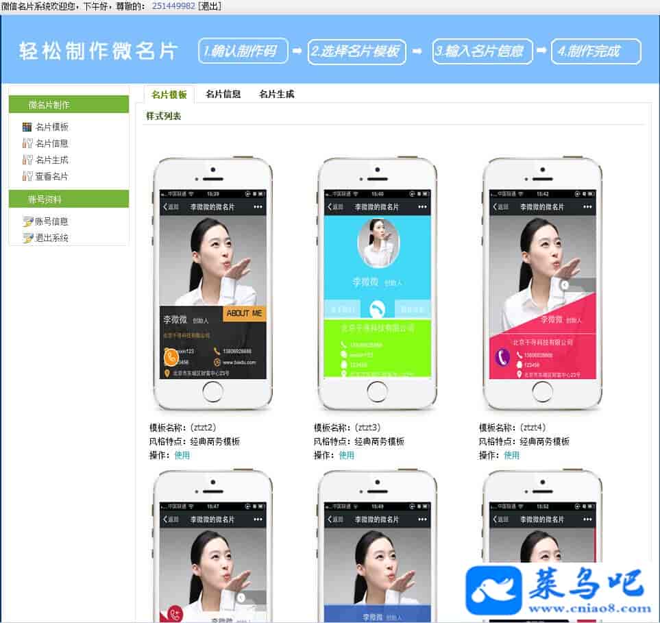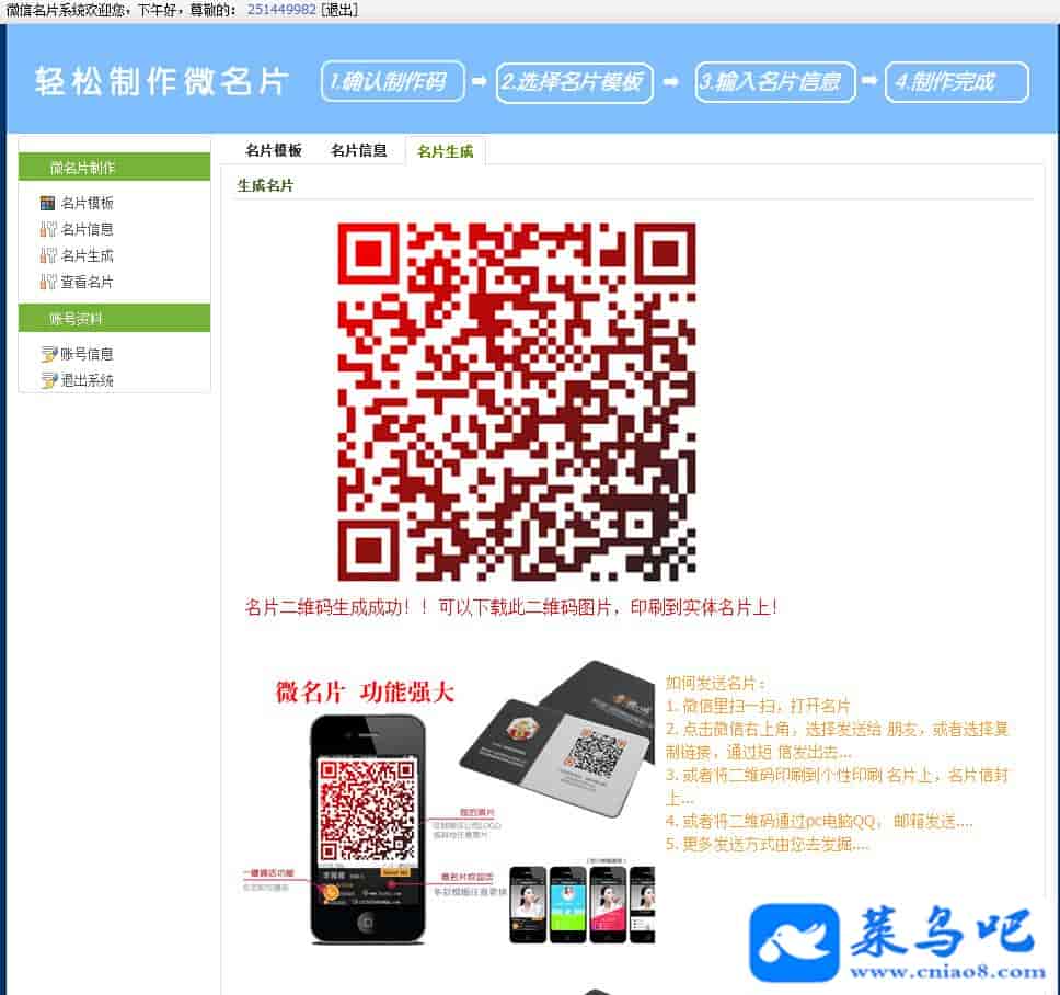 第三步:安装完毕,进入后台,生成微名片制作码卖给你的用户,其他的用户注册登陆会员中心自己操作就行了!简单!方便!更赚钱!