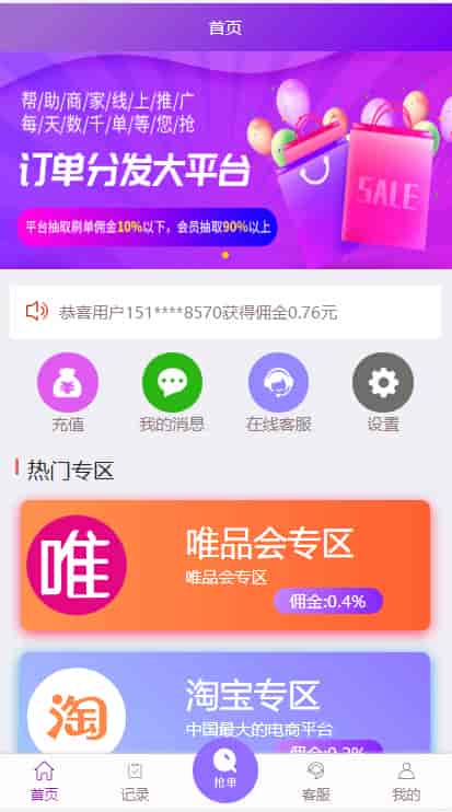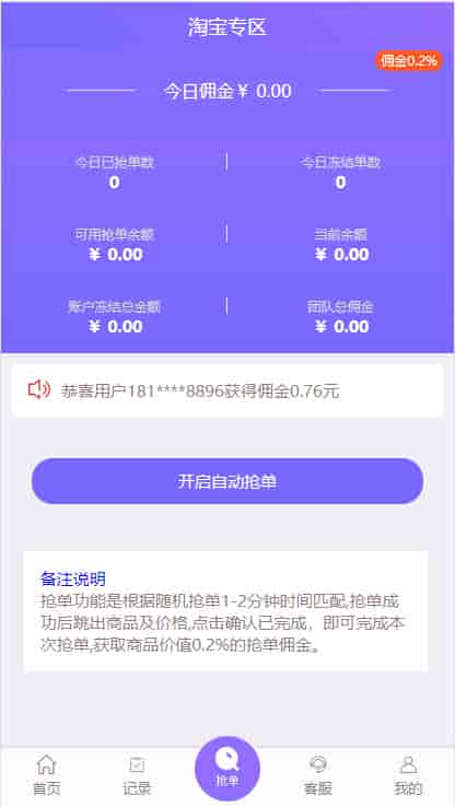 佣金是所抢金额的0.31%,可抢订单金额是余额的10-70%,每天可抢70单,抢单时间为每天8-20点。