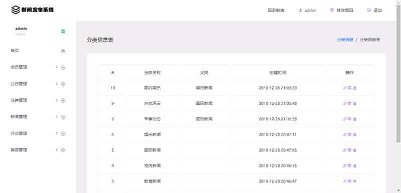 后台管理员模块:会员管理,新闻公告,分类管理,新闻管理,评论管理,留言管理等