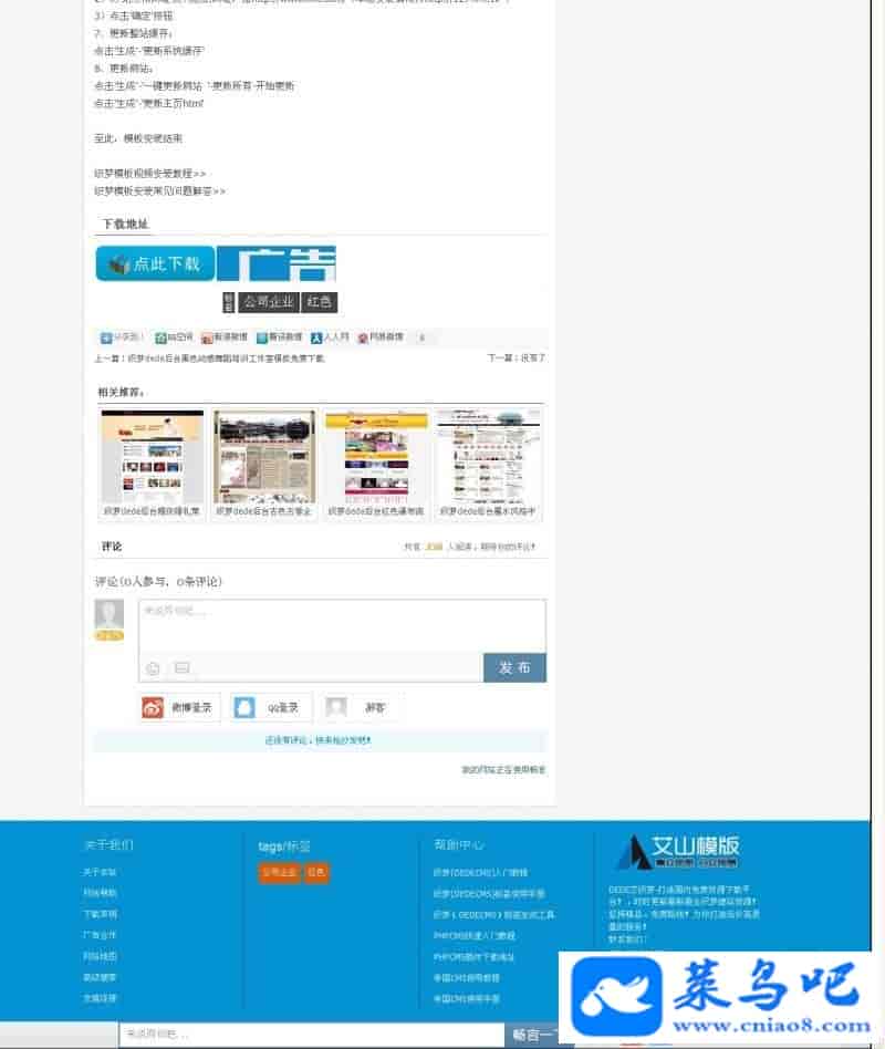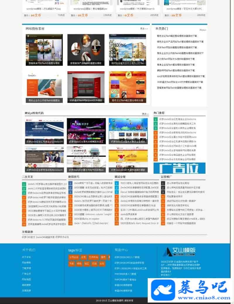 dedeCMS内核 适合做收费模板资源类下载网站基于dedecms5.7制作而成,模板包括首页、文章页,软件页、列表页、最近更新页、搜索、关于我们页、地图。 模板兼顾SEO代码优化兼容IE6/7/8、Firefox、Chrome、Opera等主流浏览器。模板特点:1、模板采用div+css编写,代码精简优化,绝对完整无错。2、模板适合做模板源码下载类,文章资讯,收费资源网站站点 。3、模板齐全,包括了首页,软件列表页,文章列表页,软件内容页,文章内容页,关于我们等的单页、搜索页的模板。4、为区分栏目和功能,已经建好栏目。5、此站配套精美的会员中心,QQ登入插件,采集文章的采集侠插件,支付宝集成接口6、此价格可享受安装指导,和使用指导,不含修改模板,二次开发等与模板无相关的服务。