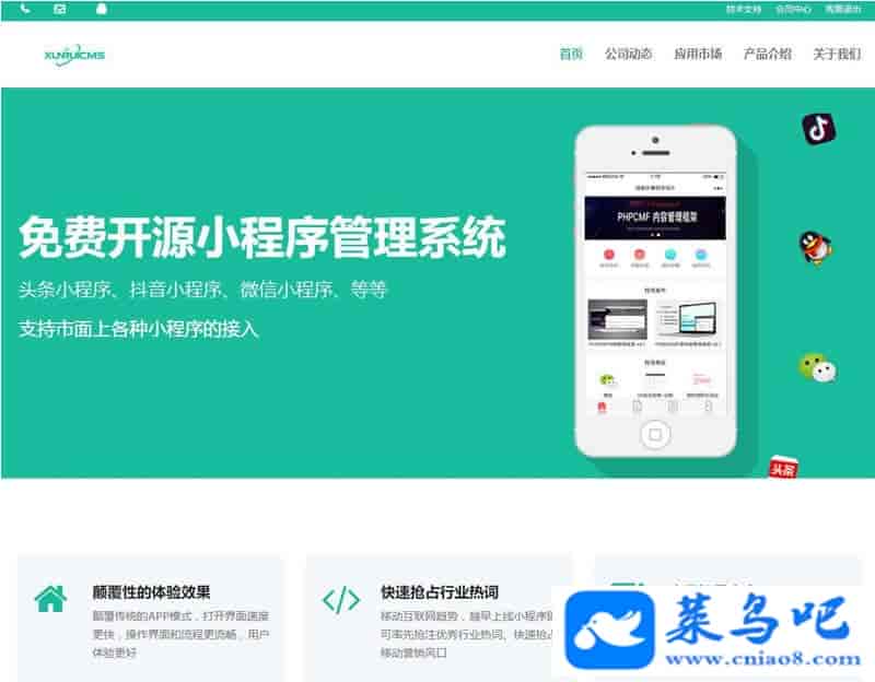 迅睿微信抖音小程序生成管理系统V1.0开源微信抖音小程序生成管理系统基于迅睿cms系统为框架,展开专用的小程序管理系统.系统将是全面开源共享,并且内置私有云市场,模板.可以根据你们自己的情况.选择性的安装.