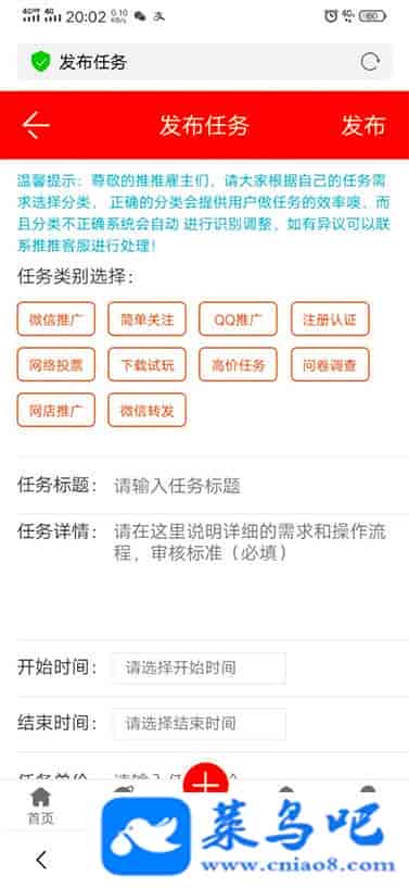 任务发布时,能按顺序填写发布任务流程,并上传任务流程图,自定义文字步骤,上传截图,流程步骤完成后自定义上传表单,需要雇主审核文字验证或者审核截图,可以上传多个审核例图。要求跳转链接