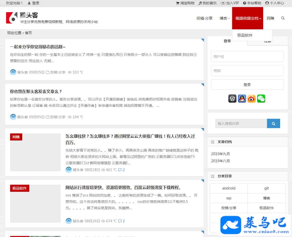 WordPress主题 2019猴头客博客站整站源码打包 带VIP会员系统源码采用了WordPress的知更鸟5.2主题进行搭建,内部seo完整,也进行了设计,直接放到服务器即可运营