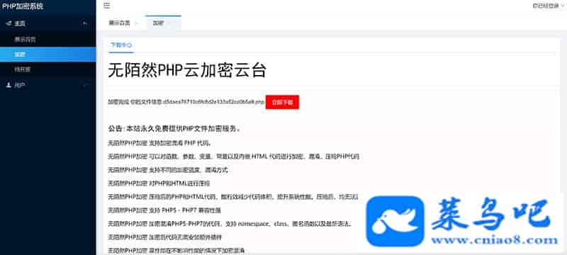 2019最新PHP在线云加密平台源码,PHP文件加密系统使用本加密,用户需要注册登录之后才能使用本加密,登录之后用户可自行上传php文件进行加密,加密成功之后即可下载,