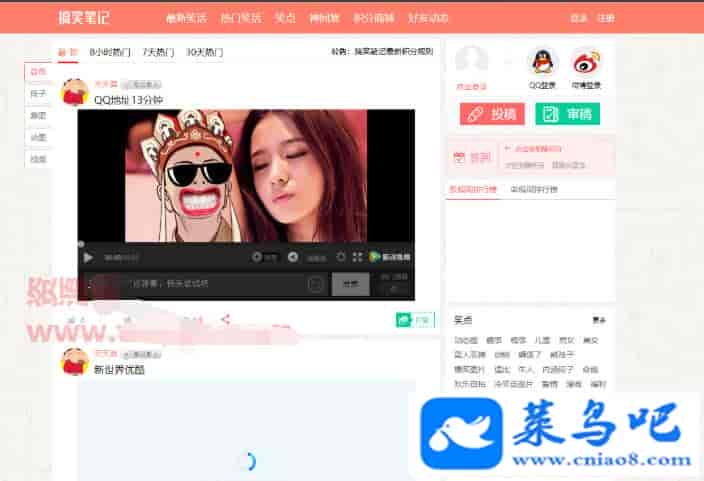 ThinkPHP仿内涵段子糗事百科笑话网站源码,包含6套PC端模板+1套WAP手机端模板+积分商城主要仿快乐麻花、臭事百科、内涵段子笑话网站的模板,后台可以一键切换模板,该系统主要包含PC端系统、WAP手机端、积分商城、QQ/微博发登录。
