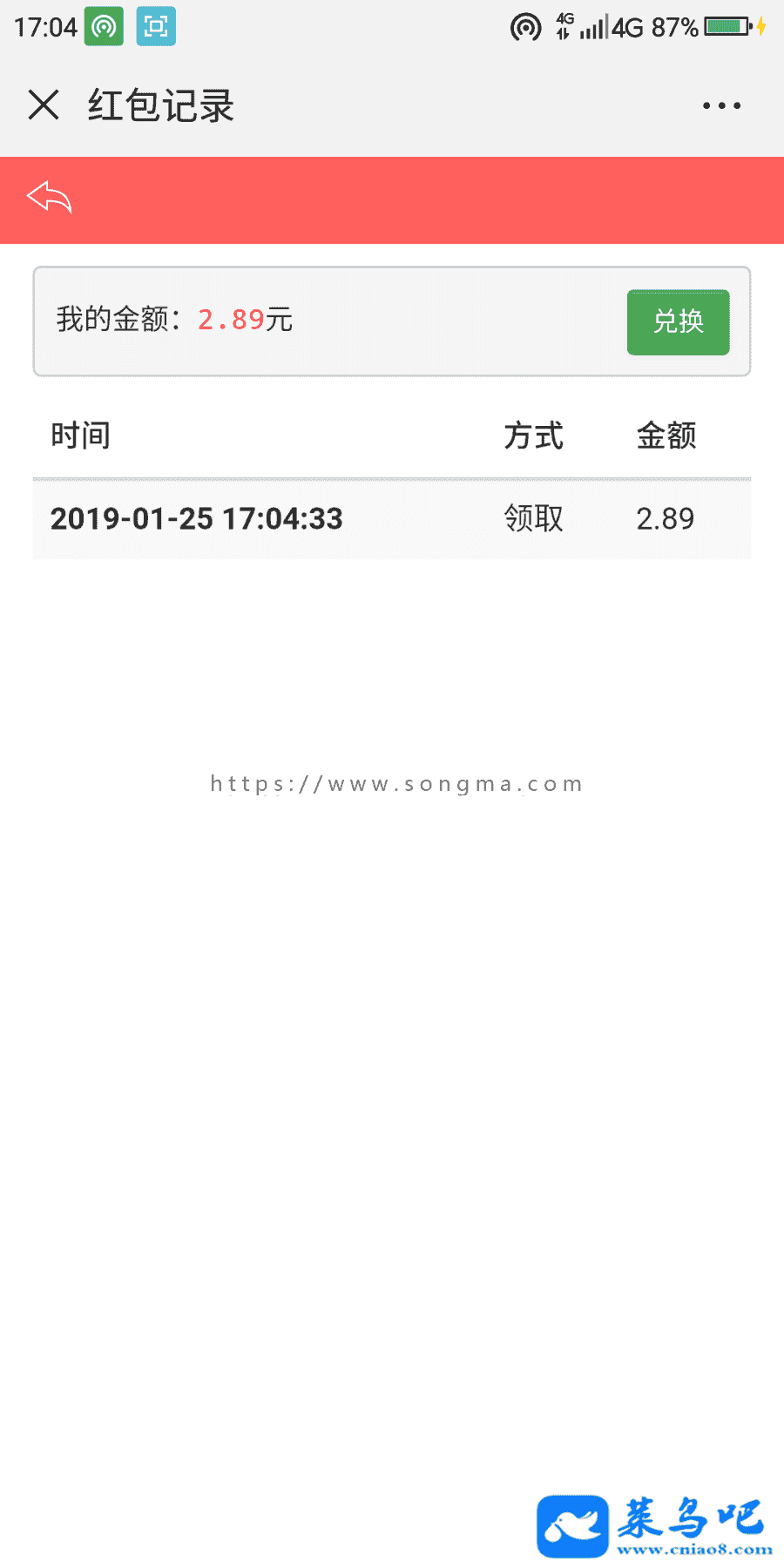 3、前台抢到红包,可申请兑换金额(后台可收到申请,人工去游戏平台给客户转化)