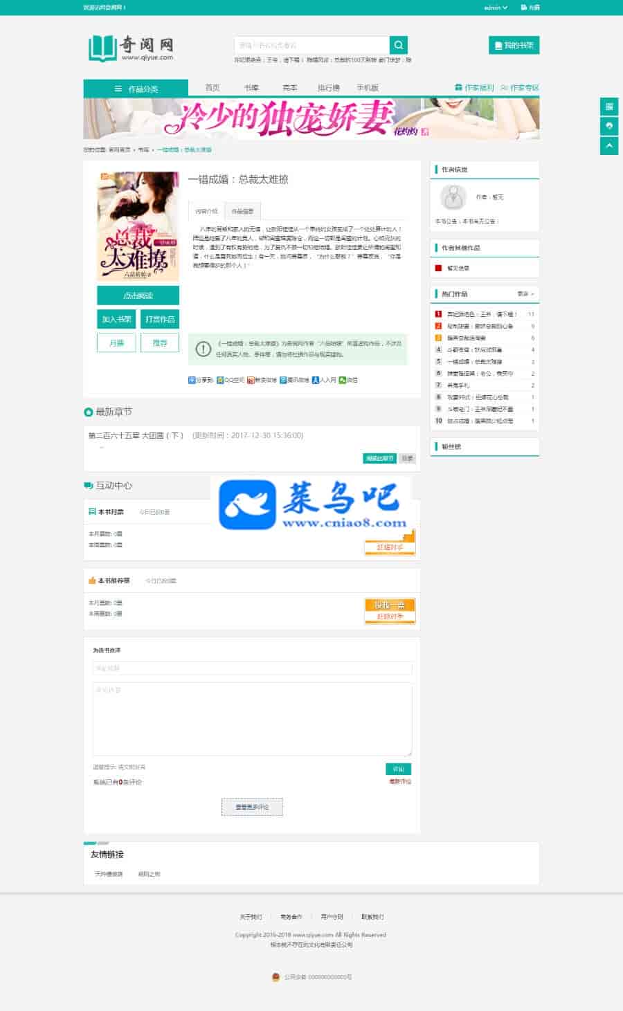 1.此套程序采用杰奇小说系统内核做的,带手机端,可以设置免费章节和收费章节,模板大气简洁,对百度非常友好;