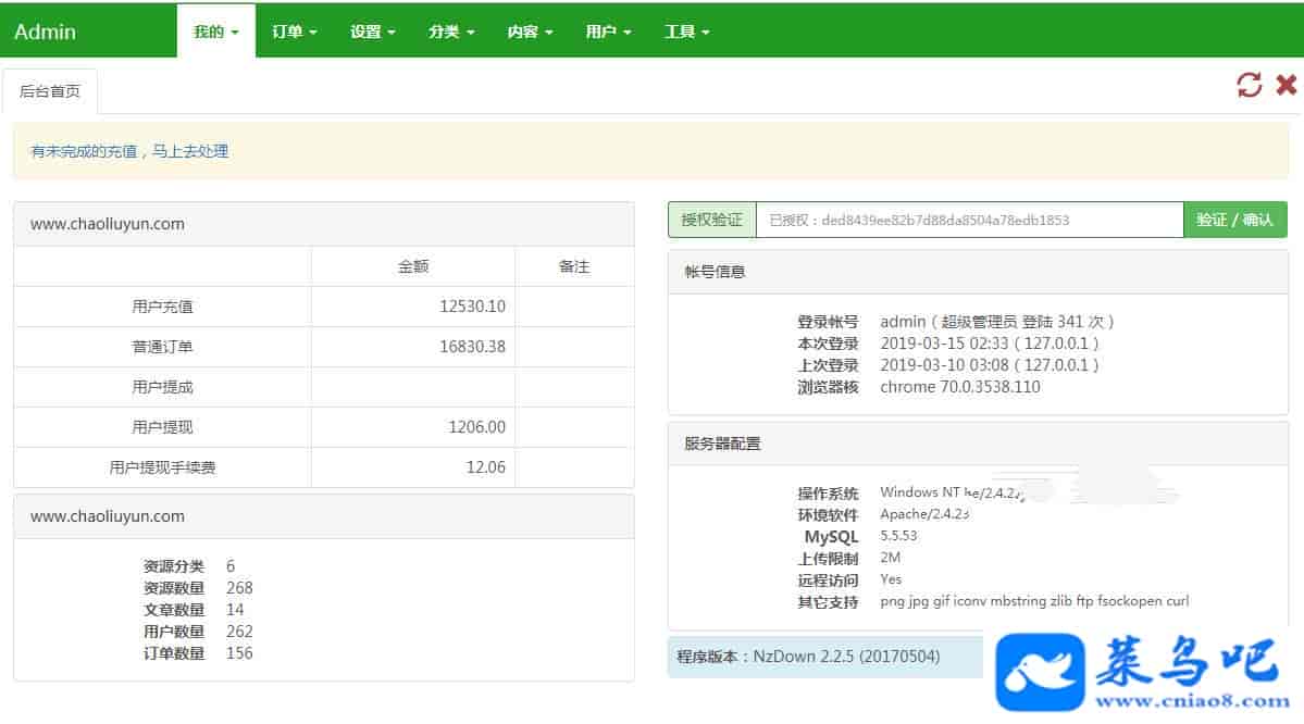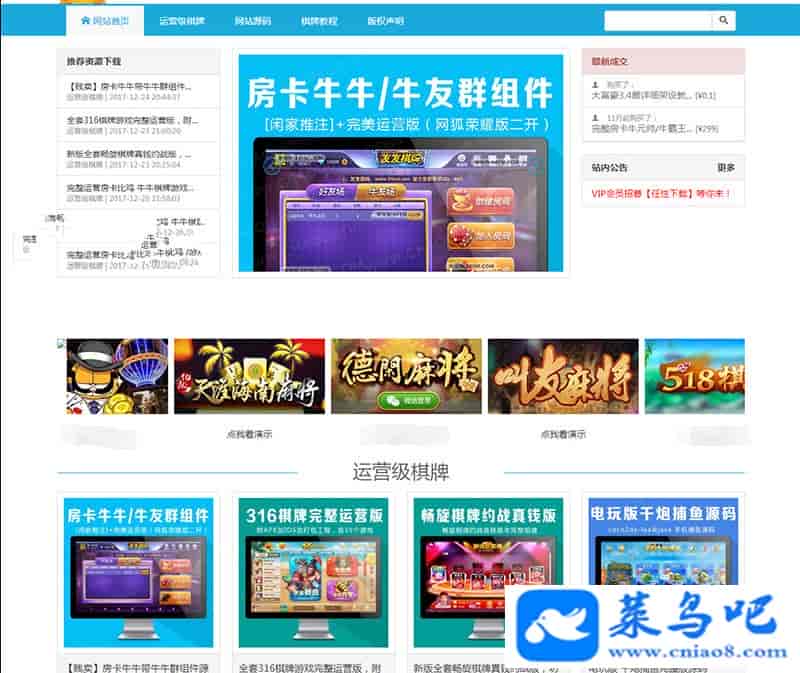 棋牌游戏资源网源码整站下载 (全站数据打包)价值上千元,数据里面有200多个宝贝。价值2500大洋,PHP+Mysql源码交易平台整站源码。本系统对运行环境无特别要求,PHP5.2以上、支持GD库即可。 集成QQ登陆接口、短信接口、支付宝即时到帐、微信扫码支付、免签约 后台多管理组、权限可自由分配 VIP会员组、会员可自助购买VIP、VIP会员专享优惠折扣 会员推广系统、按下线消费提成 会员注册红包、会员提现、后台可设置、可开关 会员邮箱认证、手机认证、可开关 资源限时特价、过期自动恢复原价 资源FAQ、交易评分、评论、3天后自动好评 多附件本地上传、网盘链接 一键百度推送、一键生成伪静态规则 站长已测试,第三方支付已无法使用