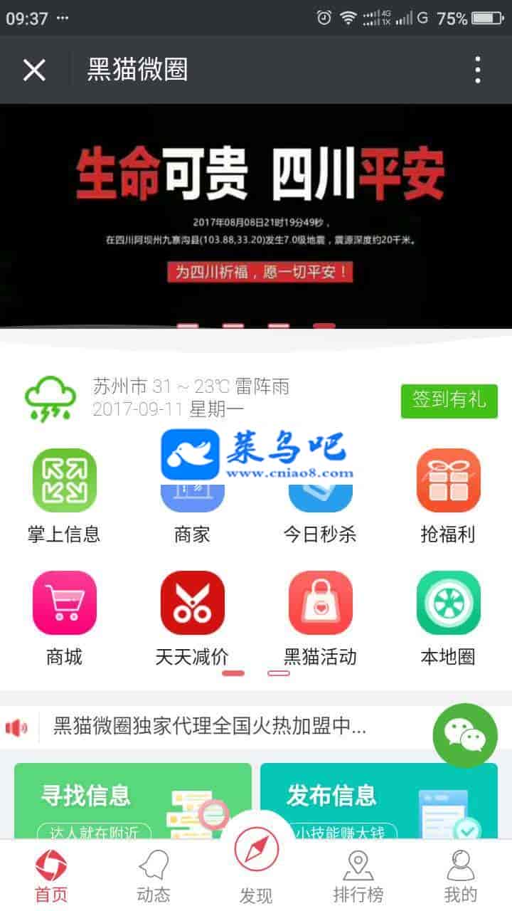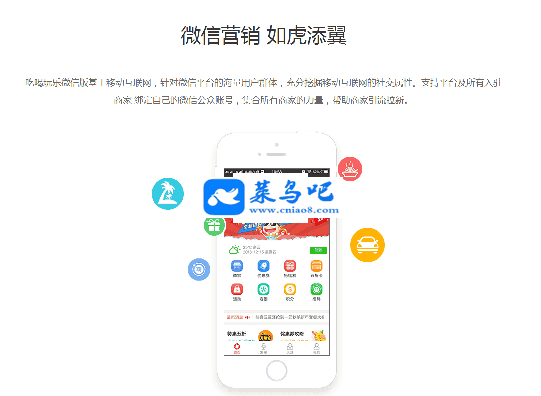 黑猫吃喝玩乐系统,是一款结合地方公众号领域的运营落地需求开发的,打造地方公众号+吃喝玩乐商圈+微信支付的营销服务的新系统。由苏州黑猫网络科技有限公司独立开发的一套系统,突破地方公众号线下商户合作无平台和图文营销无转化的困境,同时协助地方公众号进行商业模式和盈利方式转型。提高地方公众号的整合能力和核心竞争力。黑猫吃喝玩乐依托于地方微信公众号,里面的信息全部可自定义可修改,直接在本地推广自己的公众号,做地方吃喝玩乐信息广告平台。