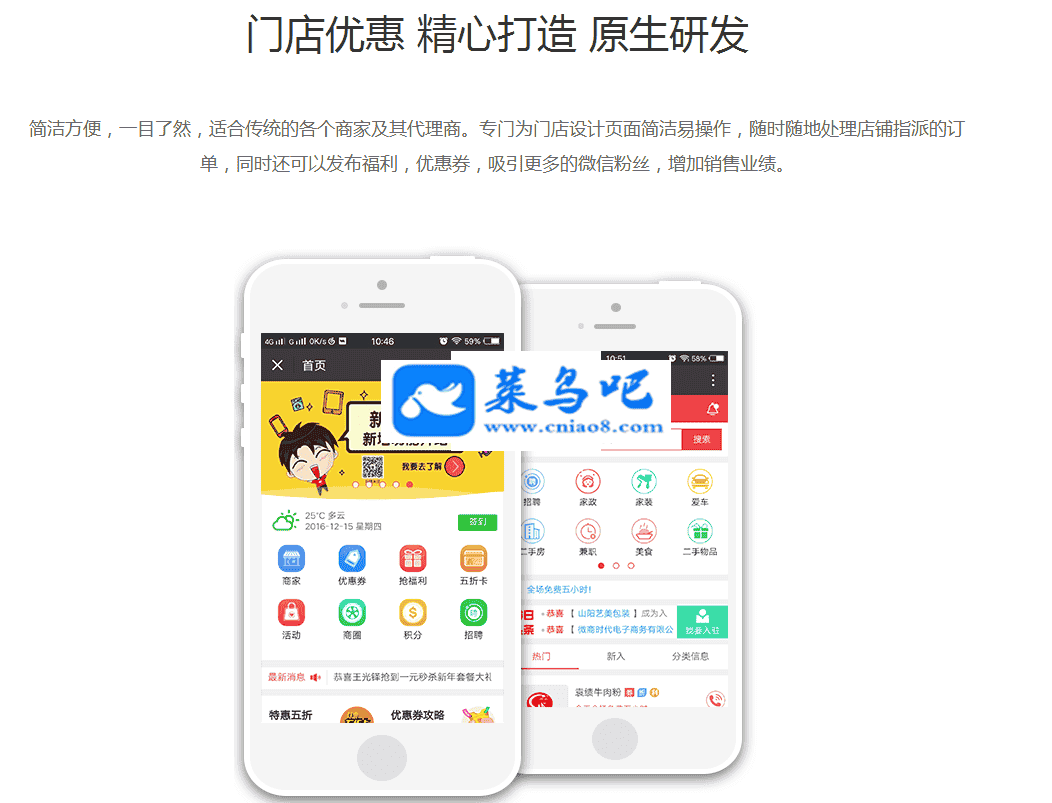 黑猫吃喝玩乐涵盖:店铺入驻(114),商家招聘,优惠卡券,五折卡,同城活动,会员服务体制,本地圈,商家助手,撒福利,积分商城,顺风车(拼车)等功能。更多功能持续开发中....