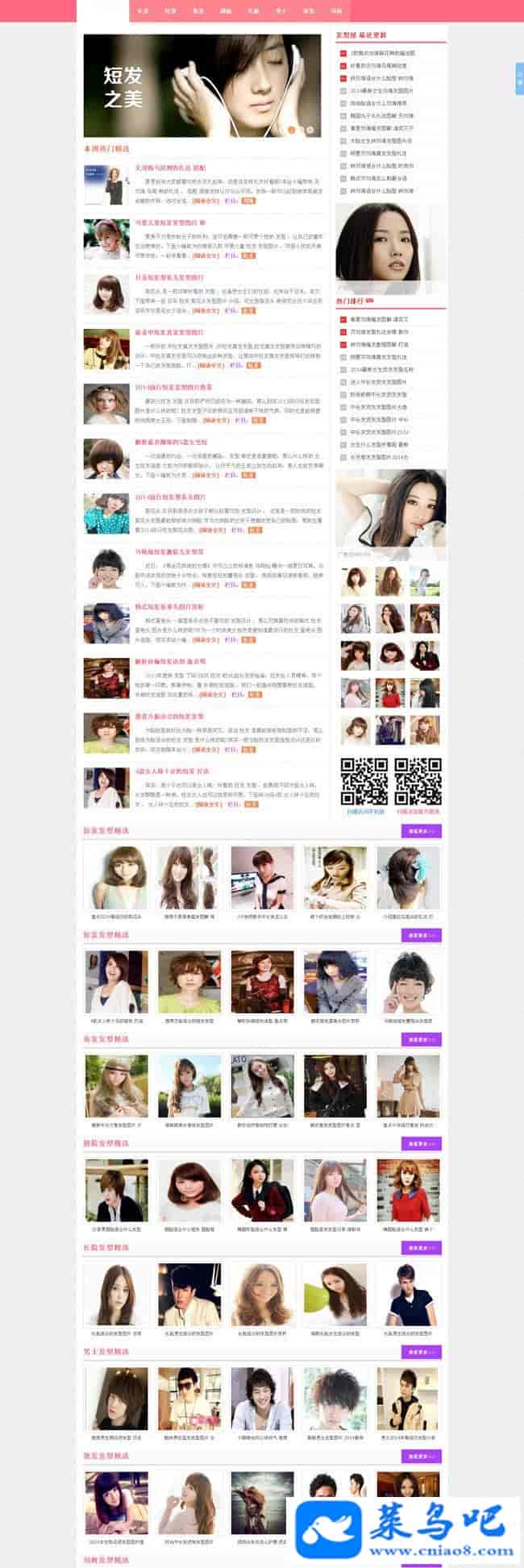 织梦DEDECMS粉色清新发型美女图片网站源码是一个自适应手机端和PC端的最新版织梦V5.7为内核的网站模板,软件兼容主流浏览器,模板包含安装说明,并包含测试数据。dedecms最新版内核开发,原创设计、手工书写DIV+CSS,完美兼容IE7+、Firefox、Chrome、360浏览器等;主流浏览器;页面简洁简单,容易管理,DEDE内核都可以使用;附带测试数据!